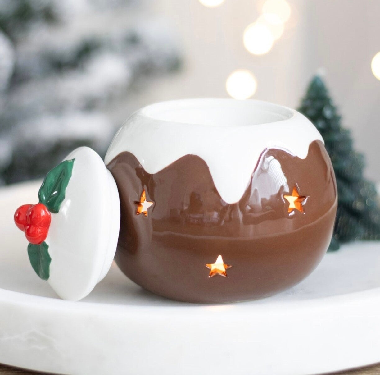 This festive wax burner comes in the shape of a traditional Christams pudding, topped with a holly leaf and red berry lid.